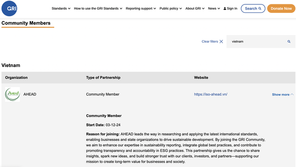 Tham gia GRI giúp AHEAD kết nối với cộng đồng doanh nghiệp, tổ chức và chuyên gia ESG trên toàn cầu, thúc đẩy trao đổi kinh nghiệm và chia sẻ thực tiễn tốt nhất về báo cáo bền vững.